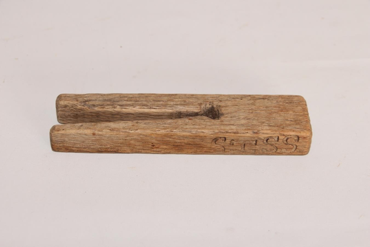 Þvottaklemma úr rekavið. L. 13 cm. Br. 3,8 cm. Þ. 1,5 cm. Lengd klaufar er 8,5 cm. Handgerð. Brennimerkt SISS á annarri hliðinni.