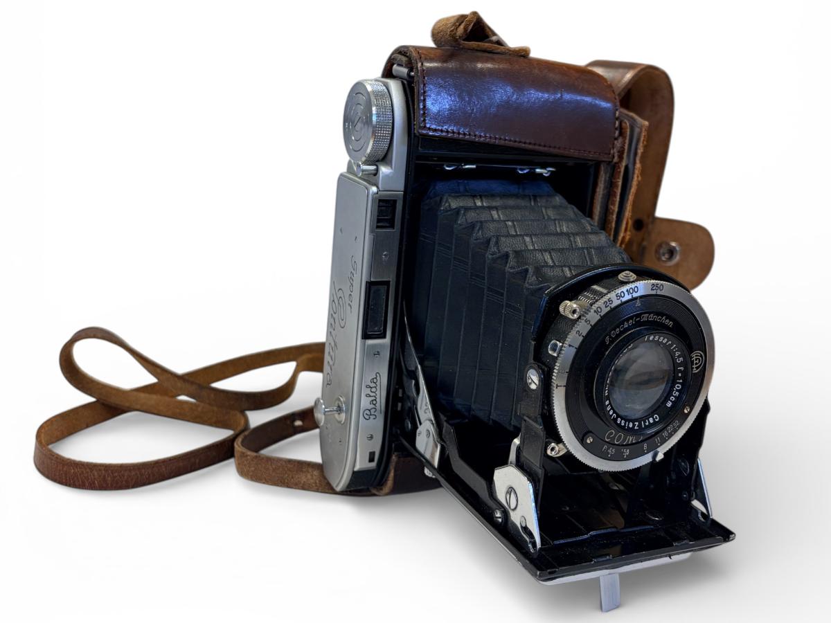 Belgmyndavél af gerðinni Super Pontura Balda. Í brúnni leðurtösku.