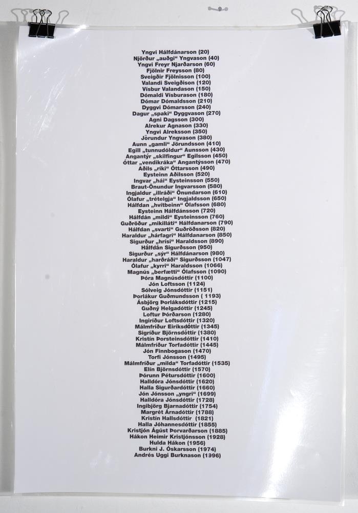 Hvítt prentað blað, plast. Hvítt og svar á litinn. Hvítt blað með nöfnum og ártölum, prentað á með svörtu. Svo virðist sem um sé að ræða upptalningu á skyldmennum (ætt). Blaðið er plastað. (skrifað 2008)