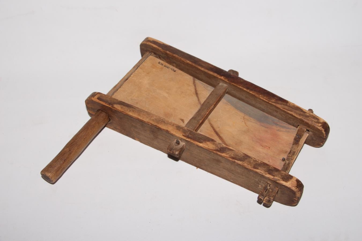 Hrossabrestur úr tré. Lengd 28 cm og hæð 24 cm. Er úr fínum viði, utan við blaðið sem er úr spónaplötu. Af venjulegri gerð, heimasmíðaður. Hann er orðinn dálítið lúinn. Stoðir sem halda við spjaldið eru farnar að springa og brotna. Hann hefur verið negldur upp að hluta. Litlir ryðgaðir naglar eru í tannhjólinu. Ca. fjórar í hverri rás.