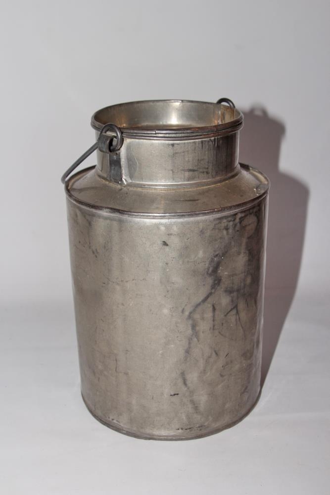 Mjólkurbrúsi úr áli. Hæð 20,5 cm með handfang niðri. Þv. botns er 13,5 cm. Þv. efri hlutar 9,5 cm. Lokinu er smellt ofan í, gert hefur verið við lokið á tveimur stöðum. Botninn er margviðgerður með allskonar ífylliefnum. Pínu beygður. Ekkert handfang er á lokinu.