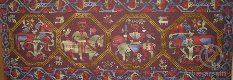 Útsaumað veggteppi, grunnur er brúnn ullarjafi.