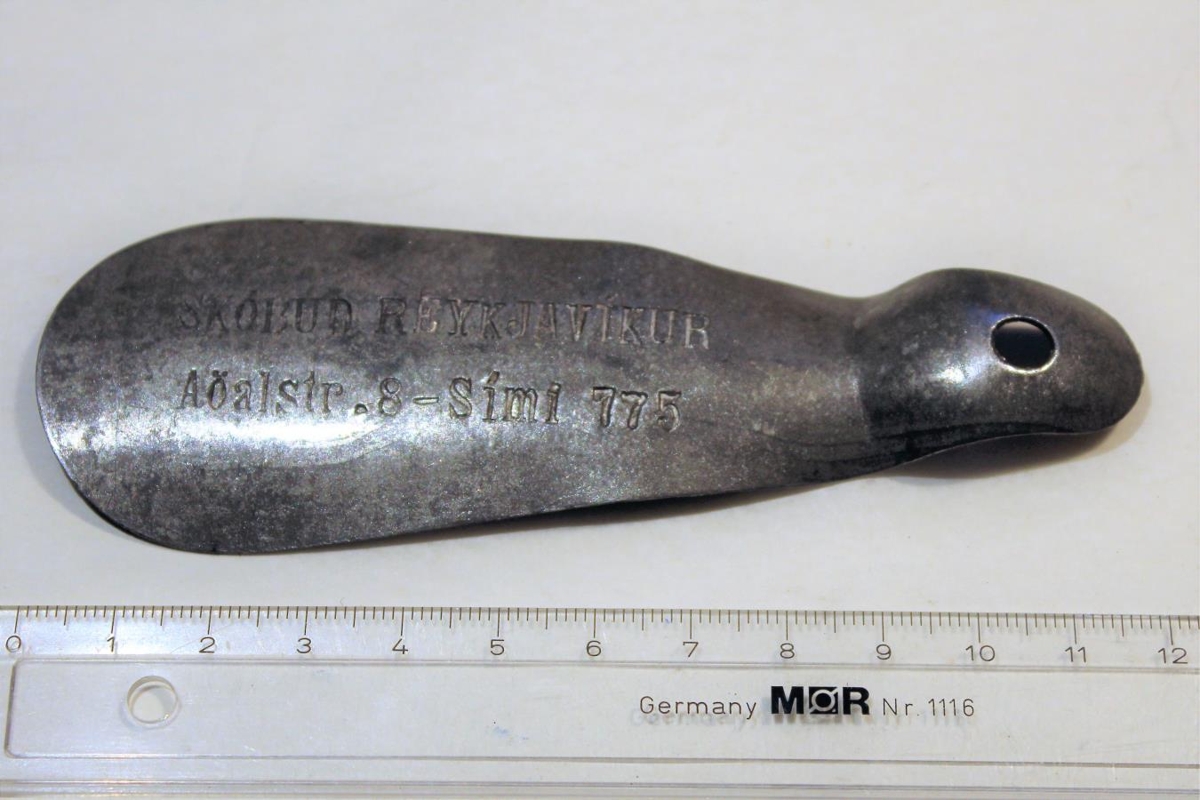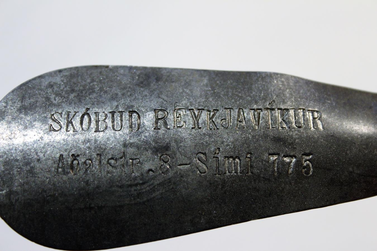 Skóhorn úr járni. Merkt SKÓBÚÐ REYKJAVÍKUR Aðalstr. 8. Sími 775. Er frá um 1930