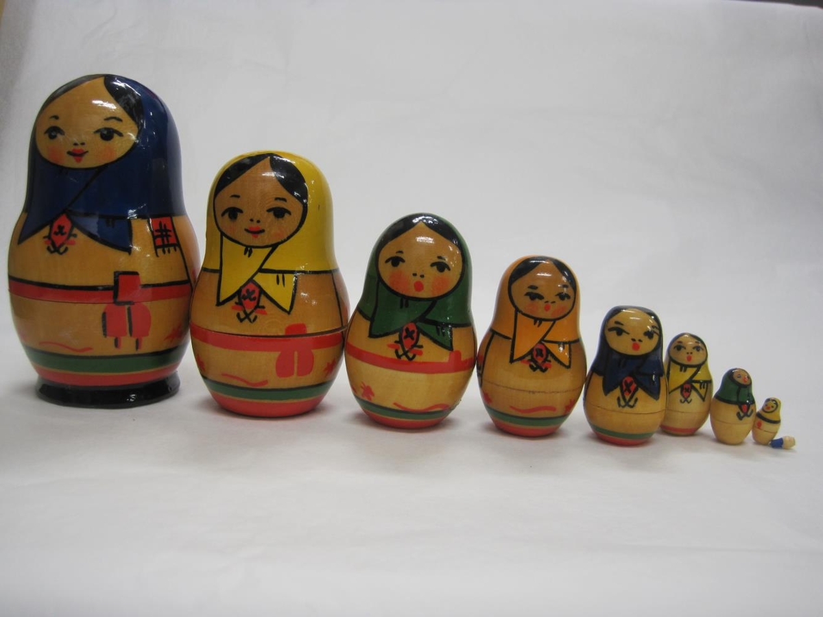 Babúska. Níu mismunandi stórar trédúkkur sem standa hver innan í annarri. Sú stærsta er 11 cm há og sú minnsta er 1 cm á hæð.