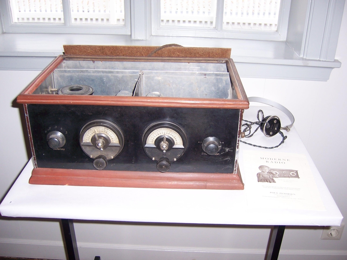 Útvarpstæki í brúnum tré- og málmkassa. Frá Poul Pedersen í Köbenhavn. Bæklingur fylgir svo og heyrnartól. Við tækið er snúra til þess að tengja það við geymi.