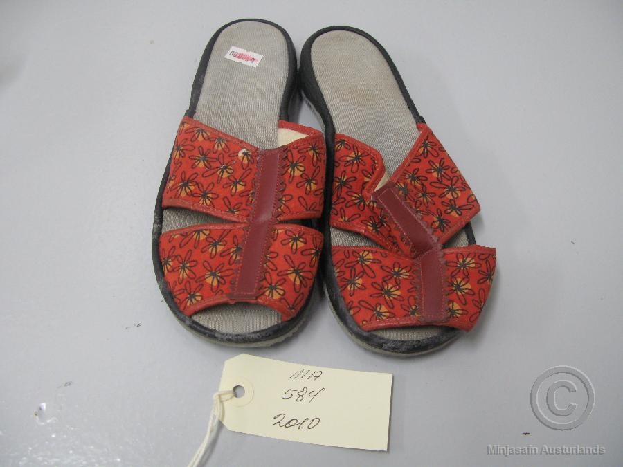 Opnir inniskór, rauðir með svörtu blómamunstri. Svartur og grár sóli. Ekki númer á sóla. Verðmiði kr. 500.-. Eru úr Verslun Pálínu Waage, Seyðisfirði.