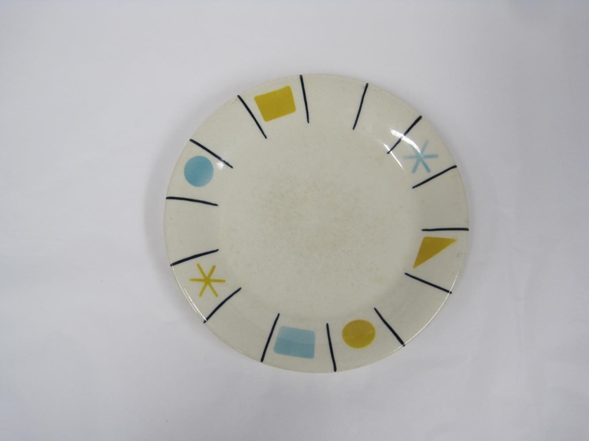 Diskurinn er ljós með svörtum strikum á barmi og á milli strikanna er skraut í gulum og bláum lit (stjörnur, ferningar, hringar og þríhyrningar).