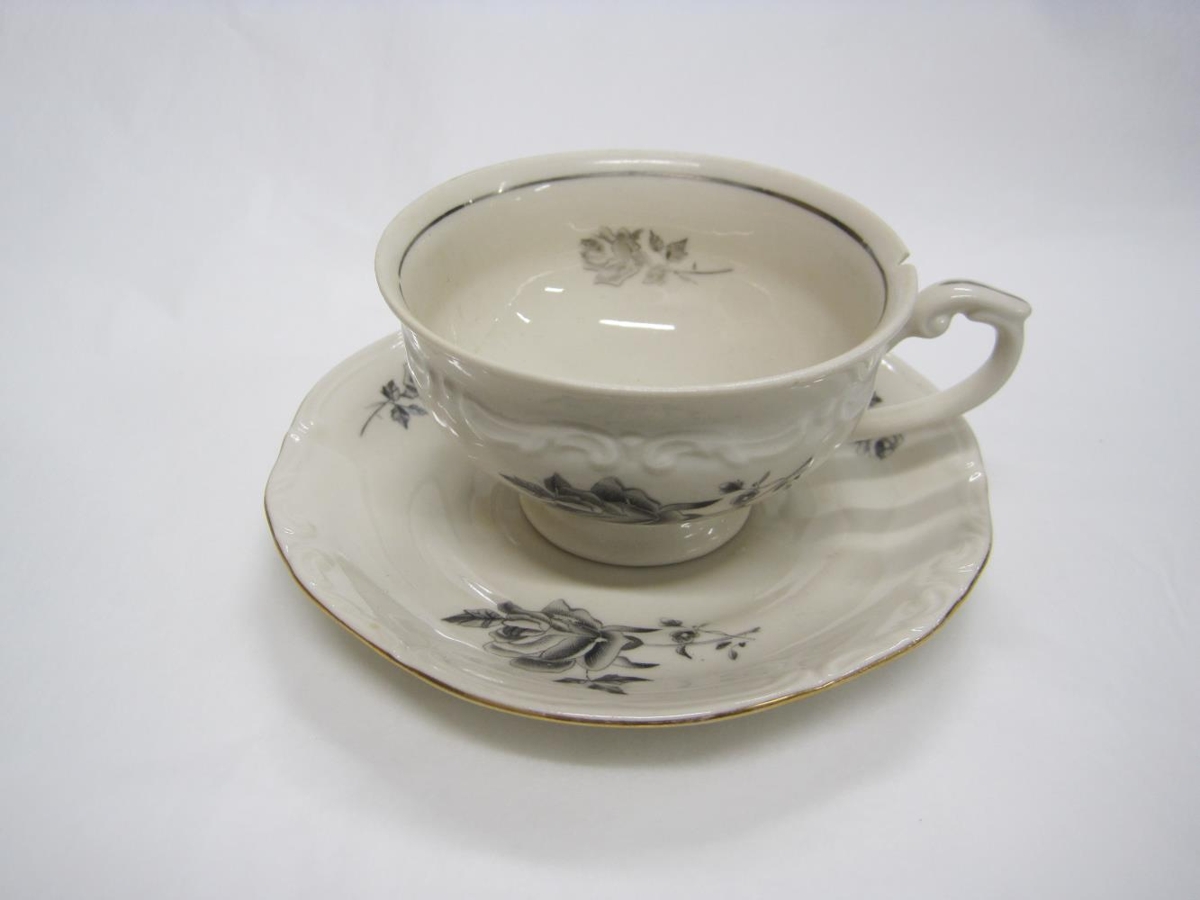 Bollapar, bolli og undirskál, ljósdrappað með grárri rós. Bollinn er lágur og víður. Á botni stendur: PT TUCOWICE Made in Poland.