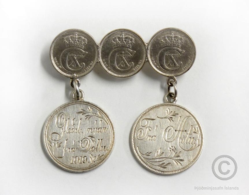 Næla sem gerð er úr þremur dönskum 10 aura myntum, frá 1917, 1918 og 1915. Þær eru bræddar saman á hliðum og hliðin sem snýr fram er með fangamarki / skjaldarmerki Kristjáns konungs tíunda (Christian X). Á bakhliðinni stendur 10 ØRE. Niður úr báðum endapeningunum hanga í hlekkjum norskar myntir (minningarpeningar) með vangamynd af Óskari öðrum (Oscar II) Noregs- og Svíakonungi. Hann var fæddur 1829, var Svíakonungur 1872 til dauðadags 1907 og Noregskonungur frá 1872 til 1905. Fyrir neðan mynd hans stendur: BRODERFOLKENES VEL. Sú hlið peninganna snýr aftur. Framhlið þeirra hefur verið slétt og á annan peninginn grafið: „Gleðil. nýár frá Völlu. 1919.“ Á hinn peninginn er grafið: „Frá Ástu.“