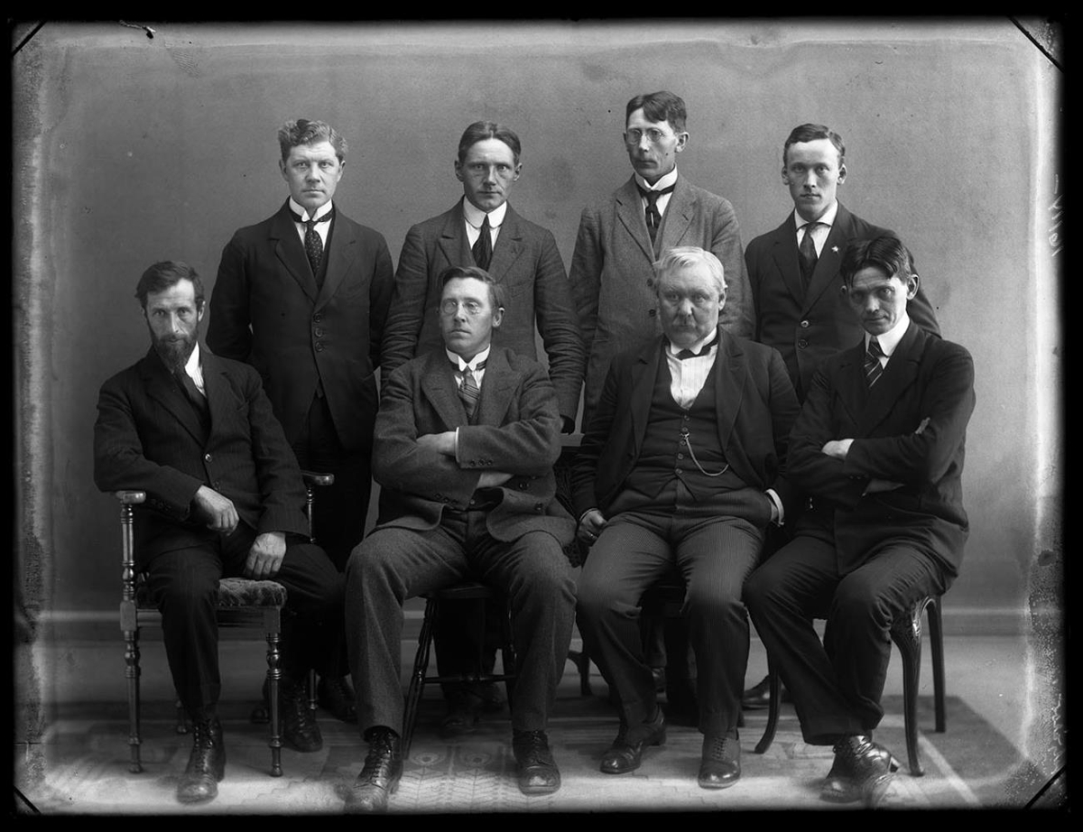 „Jón Björnsson er standandi lengst til vinstri, svo kemur Skúli. Þessi mynd er í Óðni 1. janúar 1923.“ (ES 2024)