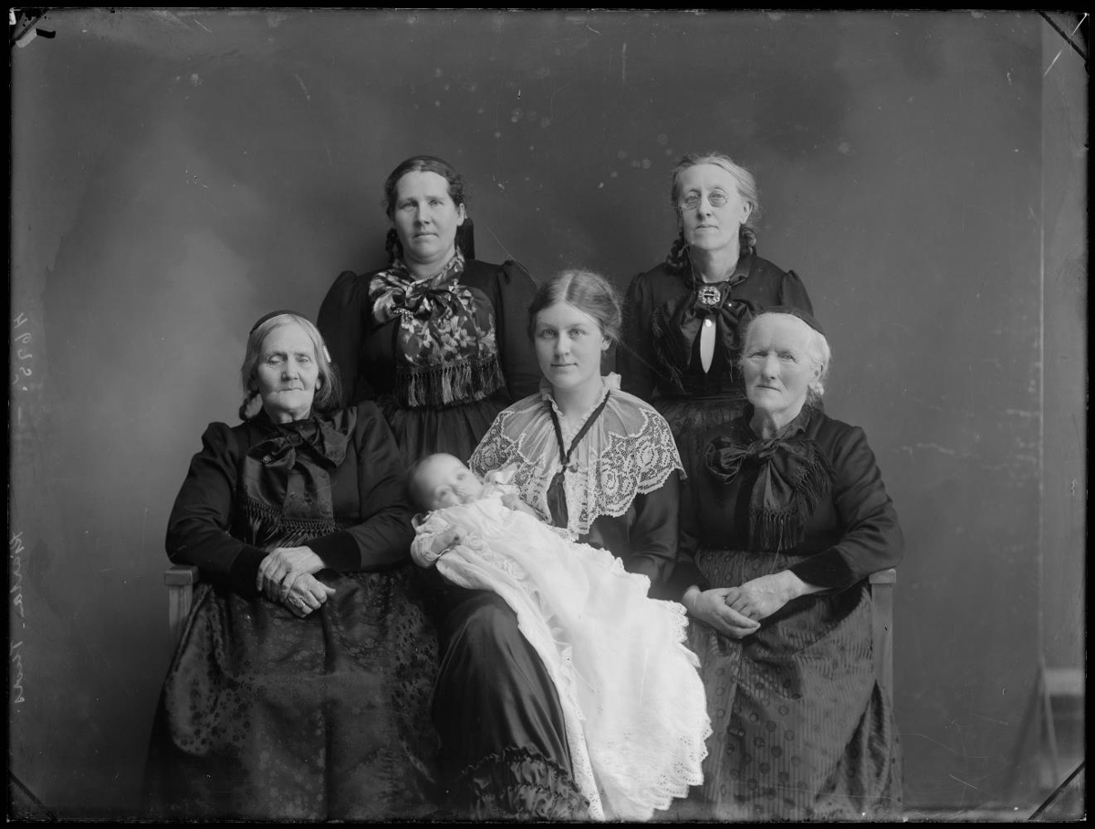 Kjartan Thors pantar myndina. Fjórar kynslóðir. Sitjandi t. f. v.: Steinunn Jónsdóttir, Ágústa Björnsdóttir Thors með Margréti dóttur sína, Ágústa Svendsen kaupkona. Standandi t. v.: Margrét Þorbjörg Jensen og Henriette Louise Svendsen. 1917. 6 saman,