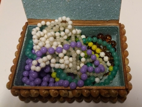 Fimm perlufestar Láru E. Túbals í Múlakoti. Eru í litlum kassa skreyttum kuðungum og skeljum. Þrjár af festunum eru úr plastperlum sem eru smelltar saman svo að hægt er að ráða lengd festarinnar.