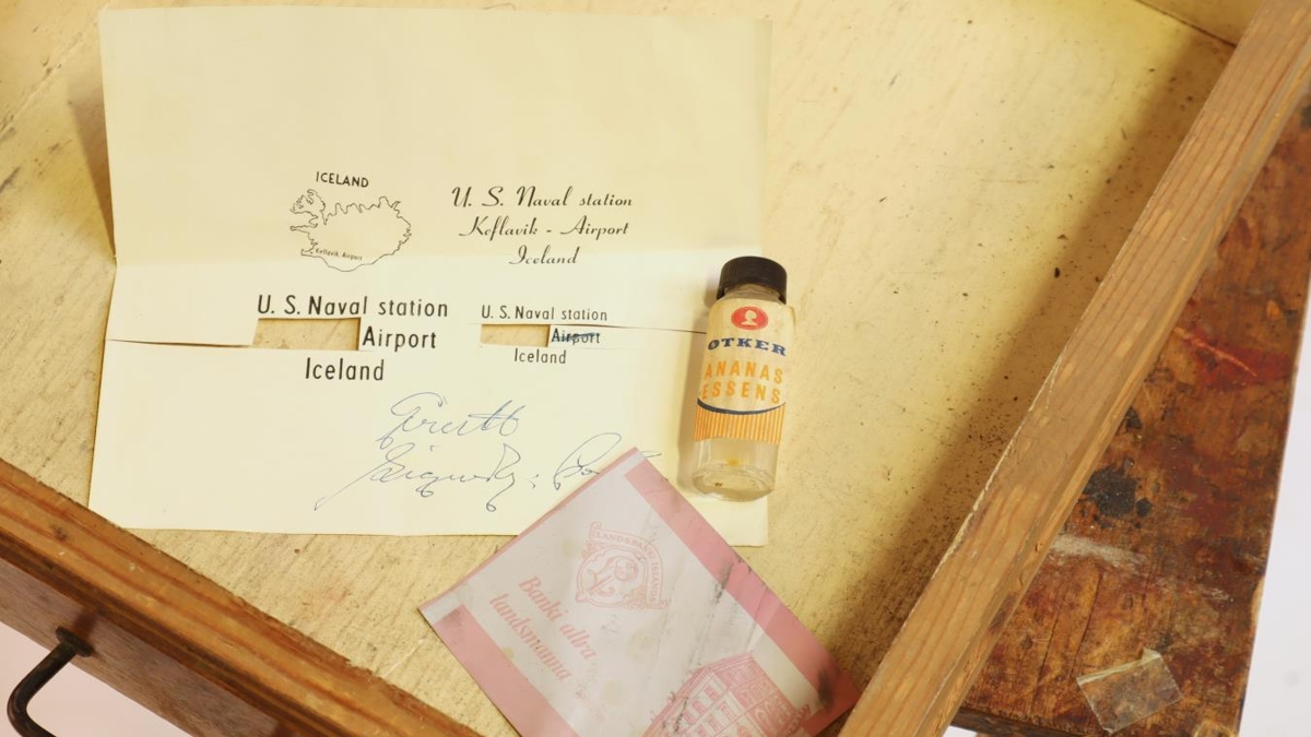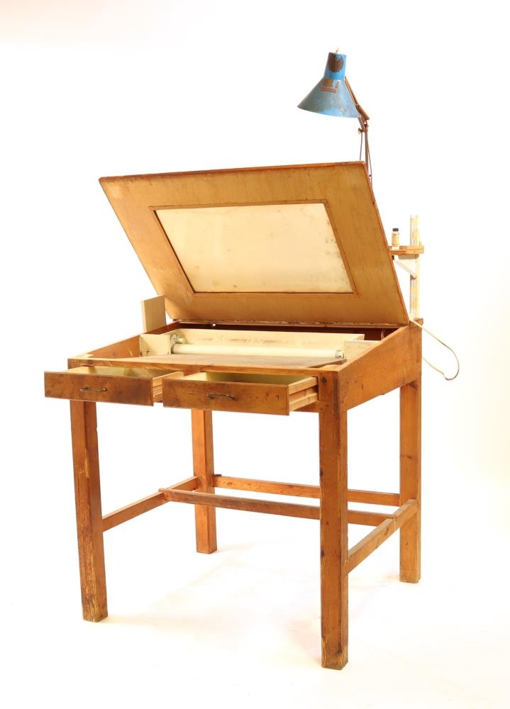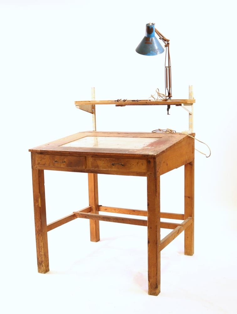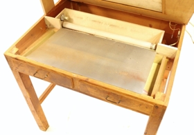 Ljósaborð úr tré og gleri. Glergluggi í borðplötunni og ljósapera þar undir. Ætlað fyrir filmuvinnu í prentmyndagerð. Nokkrir munir í skúffum.