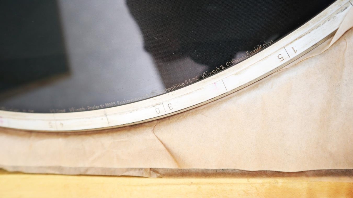 Hringrasti (hringlaga glerplata). Geymd í trékassa. Ætluð til að rasta litmyndir. Var notaður í offsetljósmyndavél frá árunum 1950 - 60.