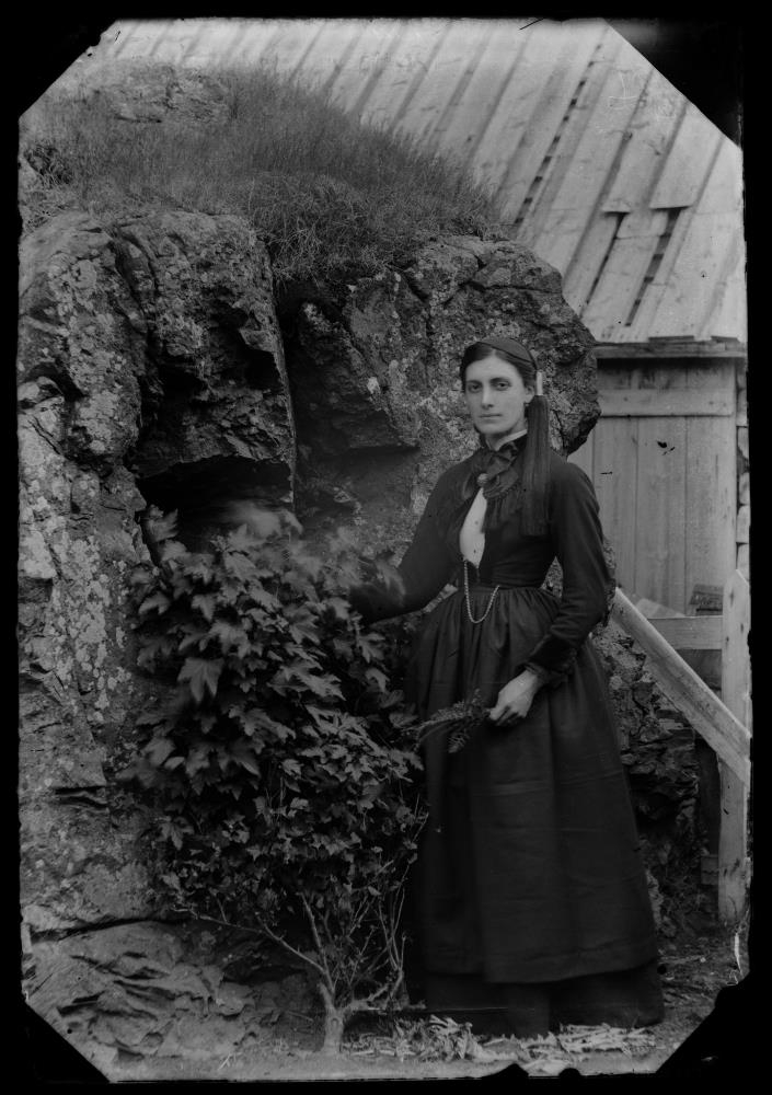 Kona stendur hjá trjáhríslu við klett. Sér í timburhús í bakgrunni.