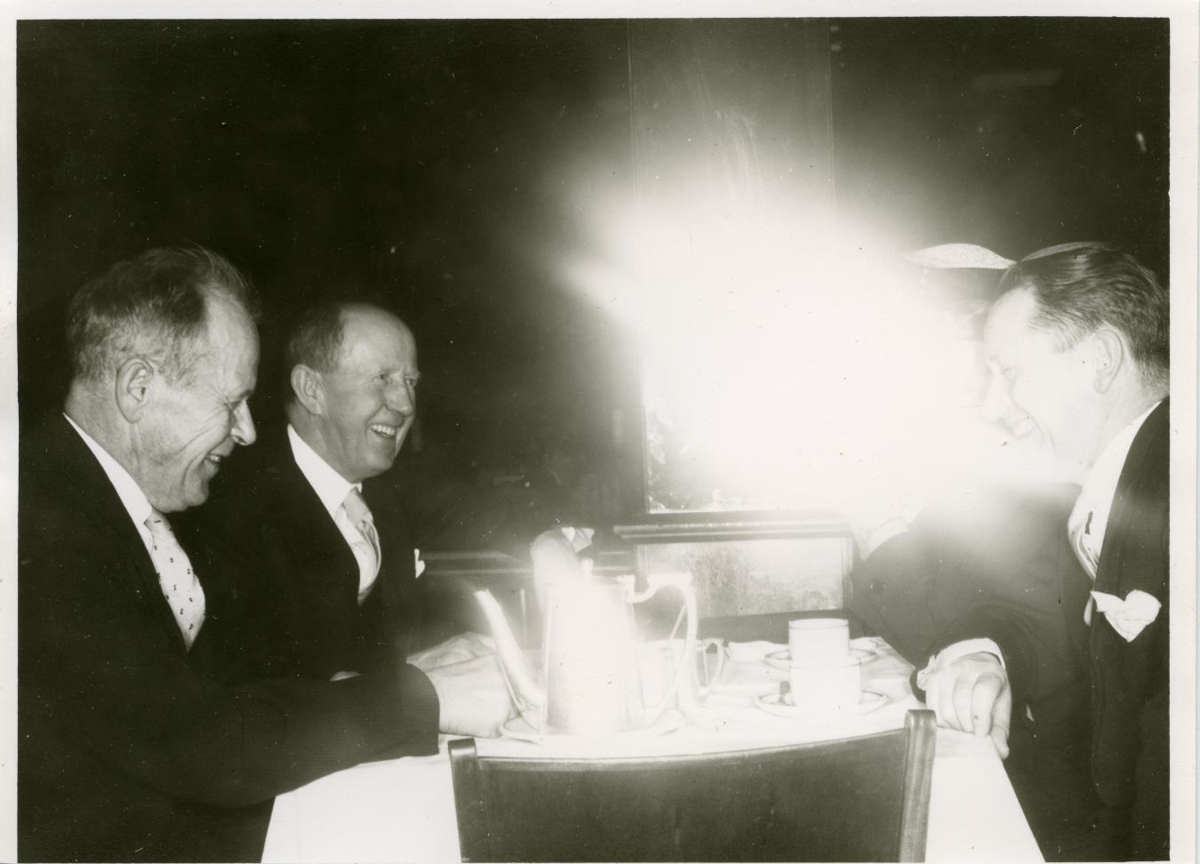 Úr áttræðisafmæli Matthíasar Þórðarsonar Bergsteinn Kristjánsson frá Árgilsstöðum, Ólafur Lárusson prófessor, Selma Jónsdóttir (sést óglöggt), dr. Sigurður Pétursson gerlafræðingur.