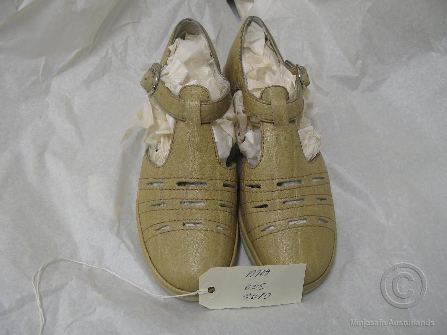 Hálfopnir skór með heilum kappa og spentir yfir rist. Skórnir eru ljósdrappaðir. Inn á sólanum stendur Obermatrial leder Sioux R Marchenhaft beguem,