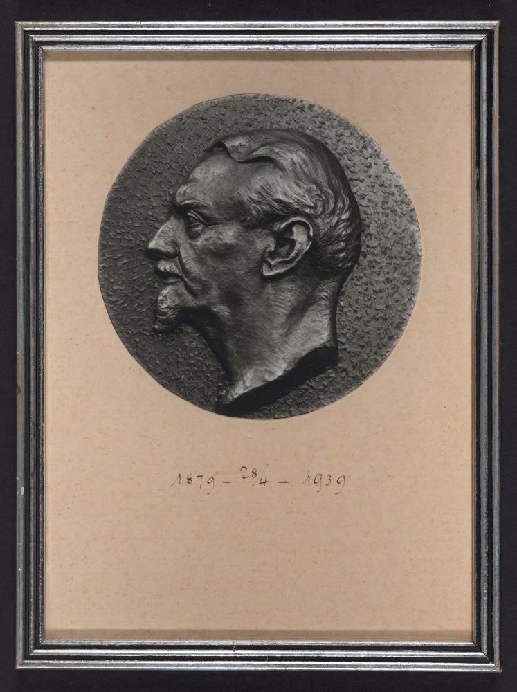 Ljósm. af lágmynd (vangamynd) líklega úr bronsi. Ljósm., hringlaga, 11cm í þvm., spjaldst.