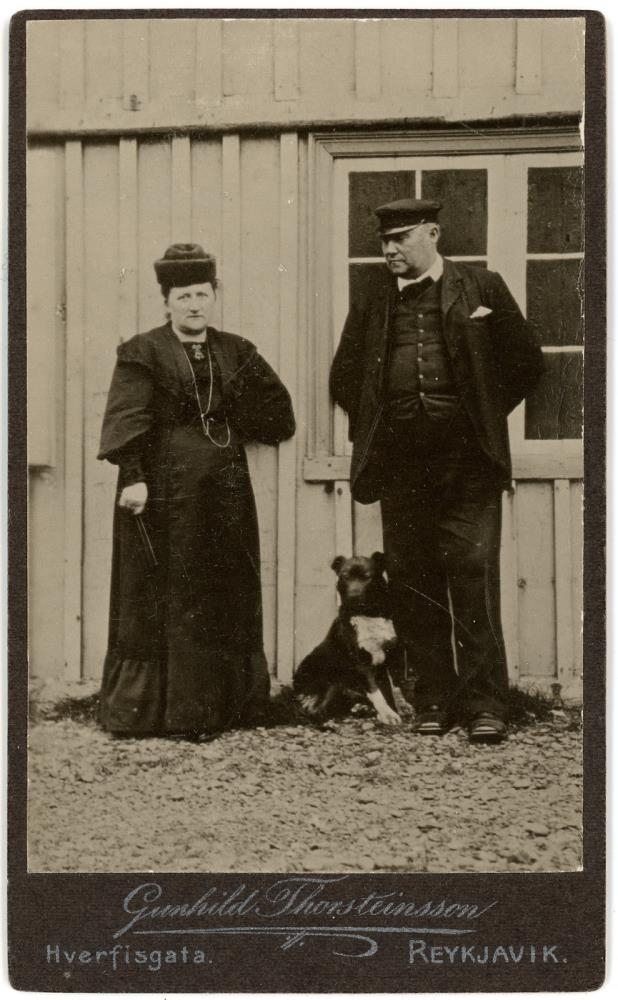 Eldri hjón standa fyrir framan húsvegg, við fætur þeirra situr hundur.