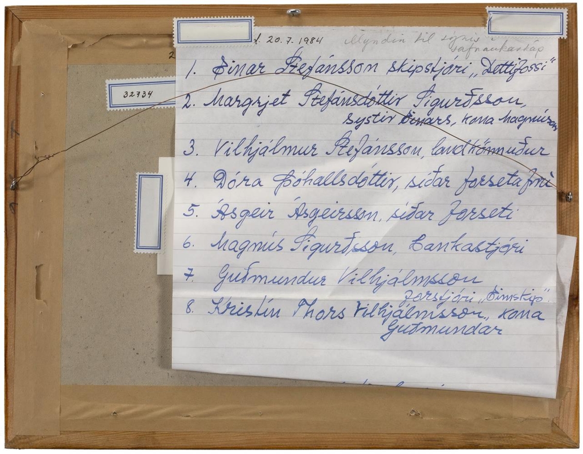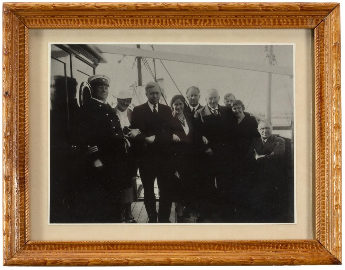 Hópmynd tekin um borð í Dettifossi á árunum 1935-39. Skv. fylgiblaði frá gefanda eru á myndinni (frá v.til.h.): Einar Stefánsson skipstjóri, Dettifossi, Margrét systir hans, seinni kona Magnúsar Sigurðssonar bankastjóra, Vilhjálmur Stefánsson landkönnuður, Dóra Þórhallsdóttir, síðar forsetafrú, Ásgeir Ásgeirsson, síðar forseti, Magnús Sigurðsson bankastjóri, Guðmundur Vilhjálmsson forstjóri Eimskips, Kristín f. Jensen (Thors) kona hans, ónafngreindur maður situr yst til hægri.