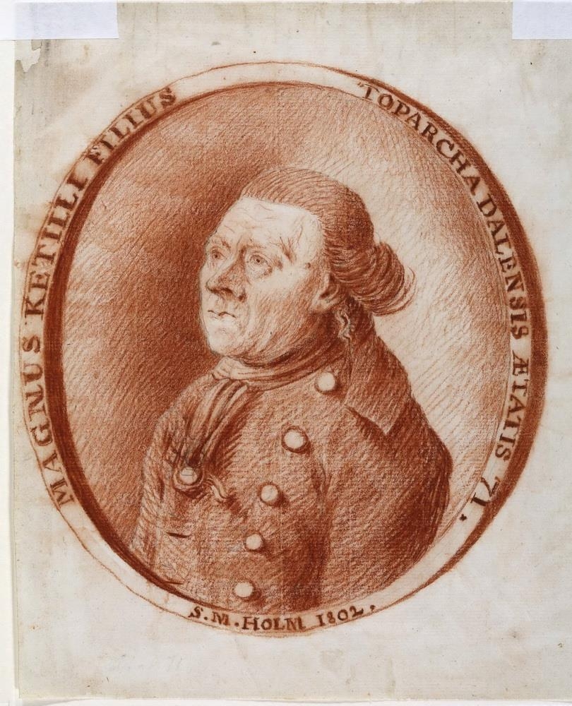 4346 Rauðkrítarmynd af Magnúsi Ketilssyni sýslumanni. Umhverfis myndina er textinn: MAGNUS KETILLIE FILIUS TOPARCHA DALENSIS ÆTATIS 71. S.M.HOLM 1802.