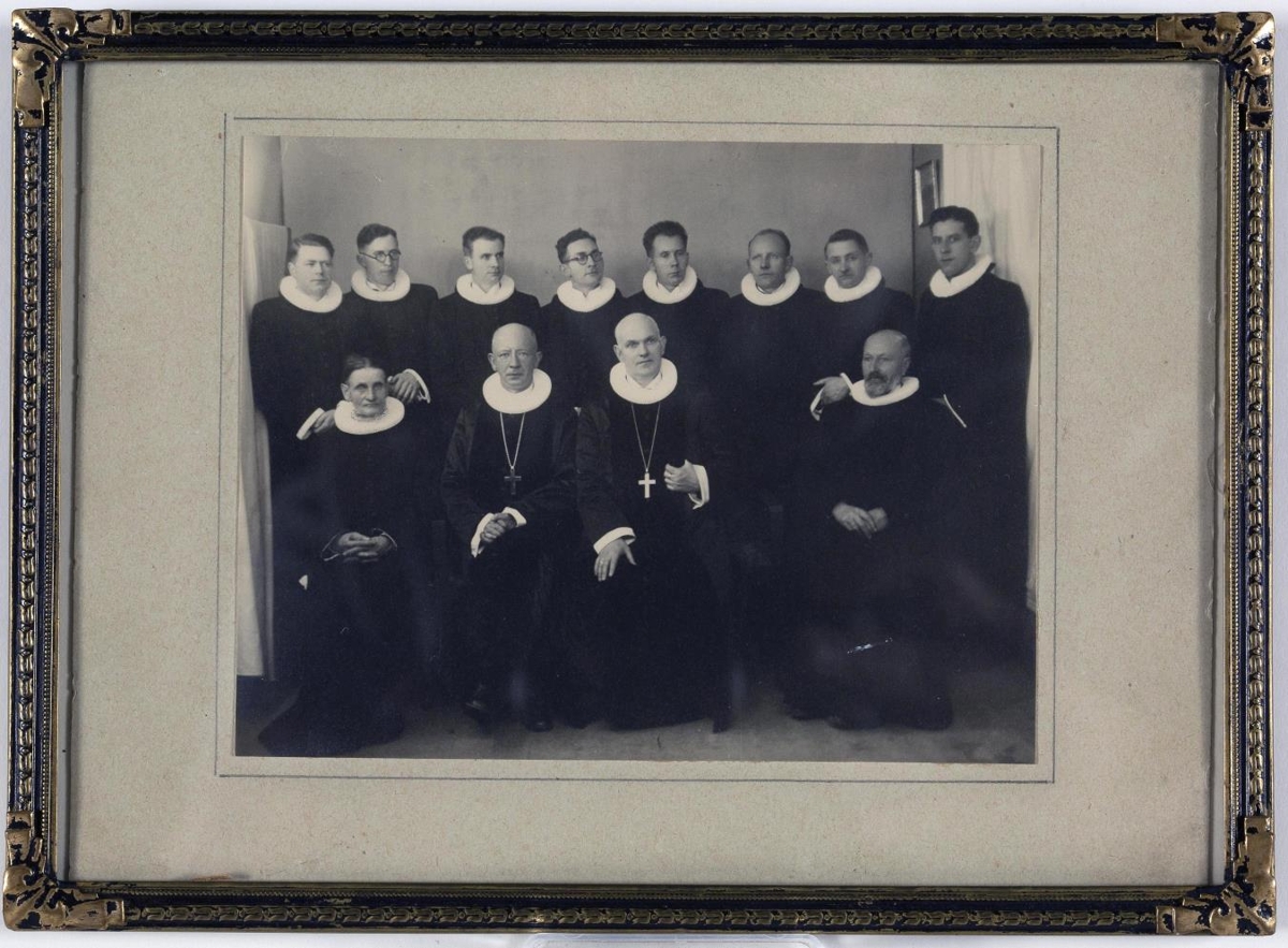 Sigurgeir Sigurðsson biskup og 11 skrýddir prestar. Ljósm. spjaldst. 16 x 22 cm í 0,8 cm br. ramma: Sigurgeir Sigurðsson biskup og 11 skrýddir prestar. Nöfn þeirra á fylgiblaði.