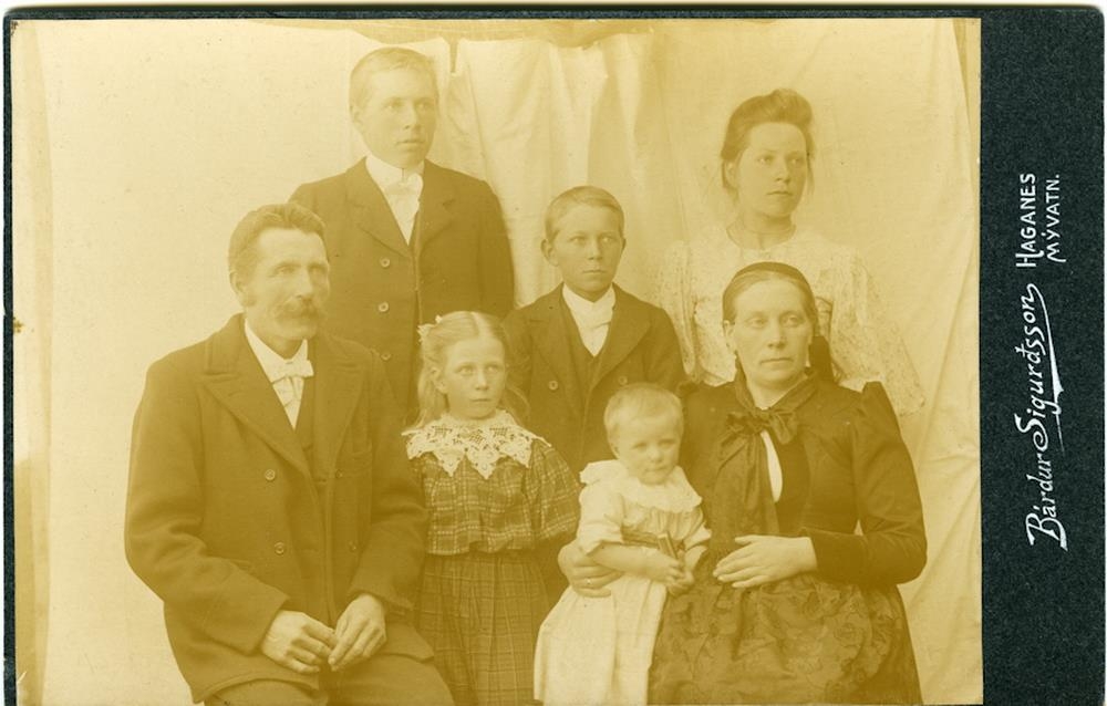 Hópm. Páll Jónsson, kona hans og börn. Ljósm. cab.: Páll Hermann Jónsson bóndi á Stóruvöllum í Bárðardal, kona hans Sigríður Jónsdóttir og börn þeirra: Jón b. á Stóruvöllum, Hermann, b. í Hlíðskógum, Þuríður g. Baldri Jónssyni á Stóruvöllum, Aðalbjörg, g. Agli Þorlákssyni kennara, Húsavík og Dagrún bústýra á Stóruvöllum.