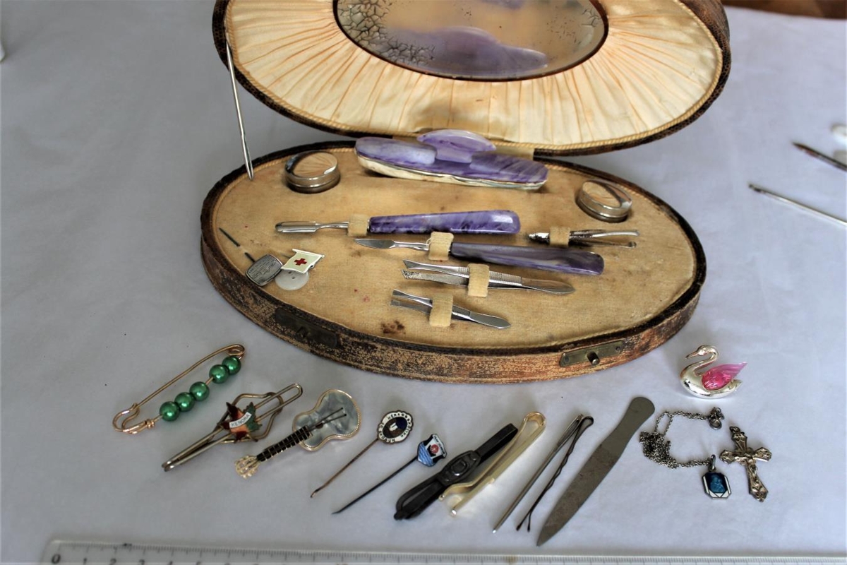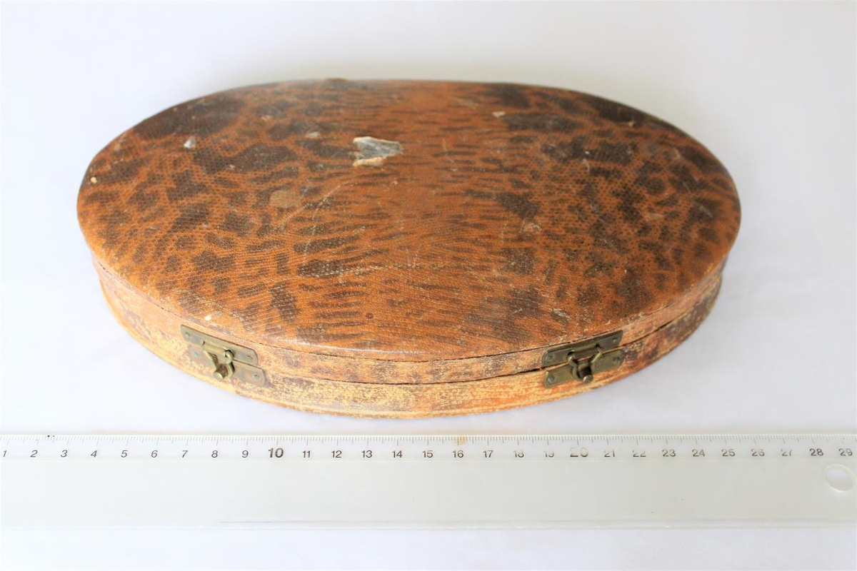 Brún pappaaskja. Spegill innan í loki. Sporöskjulaga, 24 x 15 cm. Er með snyrtidóti ofl. m.a. lítill róðukross úr málmi. Var í eigu Guðbjargar Þorleifsdóttur.