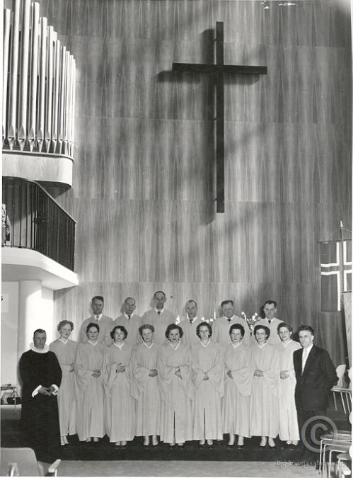 Kirkjukór stendur við vegg í kirkju, krossmark uppi á veggnum, t.v. sér í svalir og hluta pípuorgels og t.h. íslenska fánann og predikunarstól. Presturinn stendur t.v. og kórstjórnandinn t.h.
