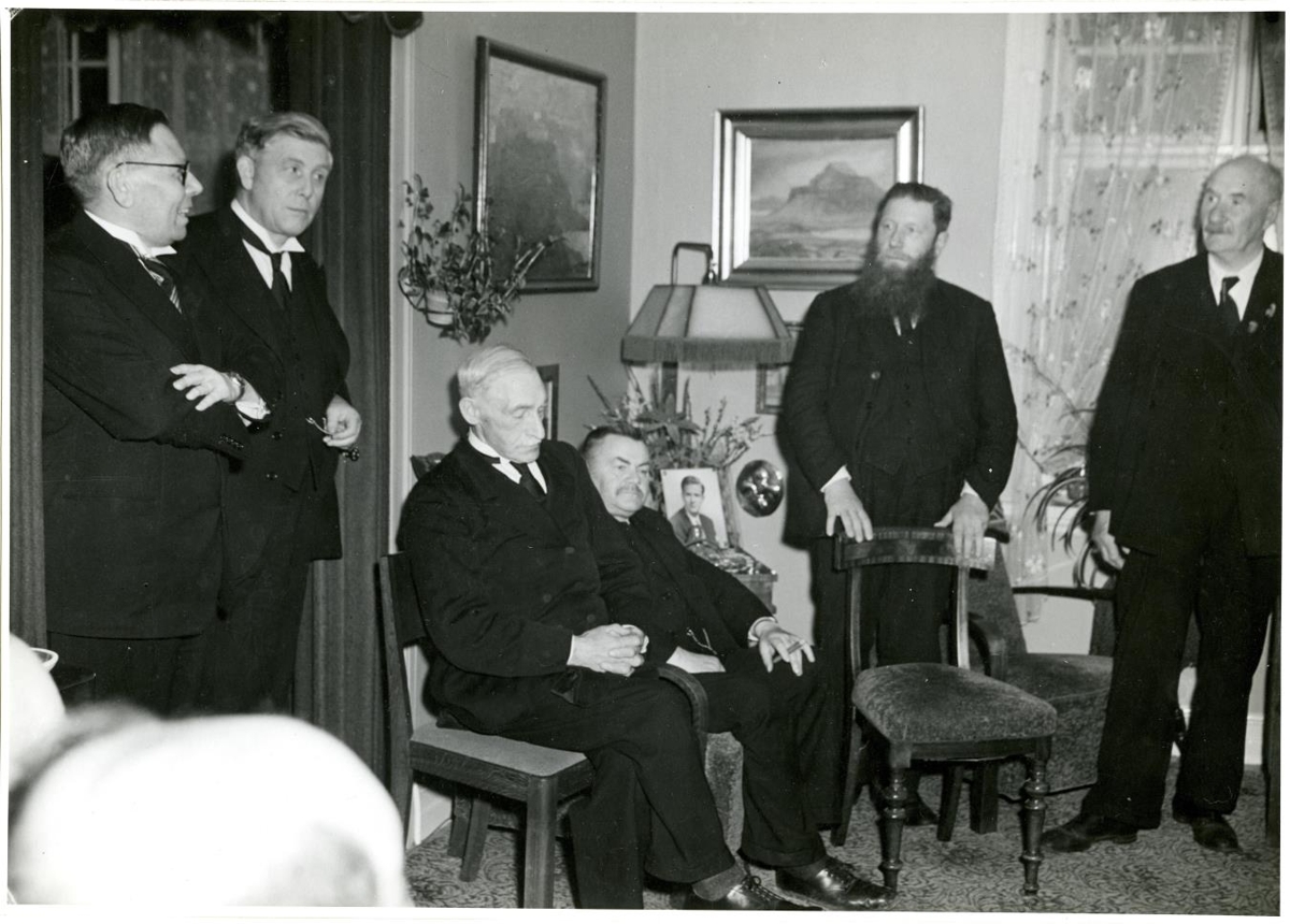 "í biskupsboði á Gimli", hópm. 5 prestar og biskup Ljósm. 16 x 22,5 cm., spjald 25 x 31 cm: Hópmynd: "Í biskupsboði, á Gimli": Ásmundur Guðmundsson biskup, sr. Magnús Guðmundsson Ólafsvík, Sr. Ólafur Magnússon, Arnarbæli, sr. Brynjólfur Magnússon, Stað í Grindavík, sr. Sigurður Nordal (Norland) , Hindisvík og sr. Jónmundur Halldórsson, Stað í Grunnavík.