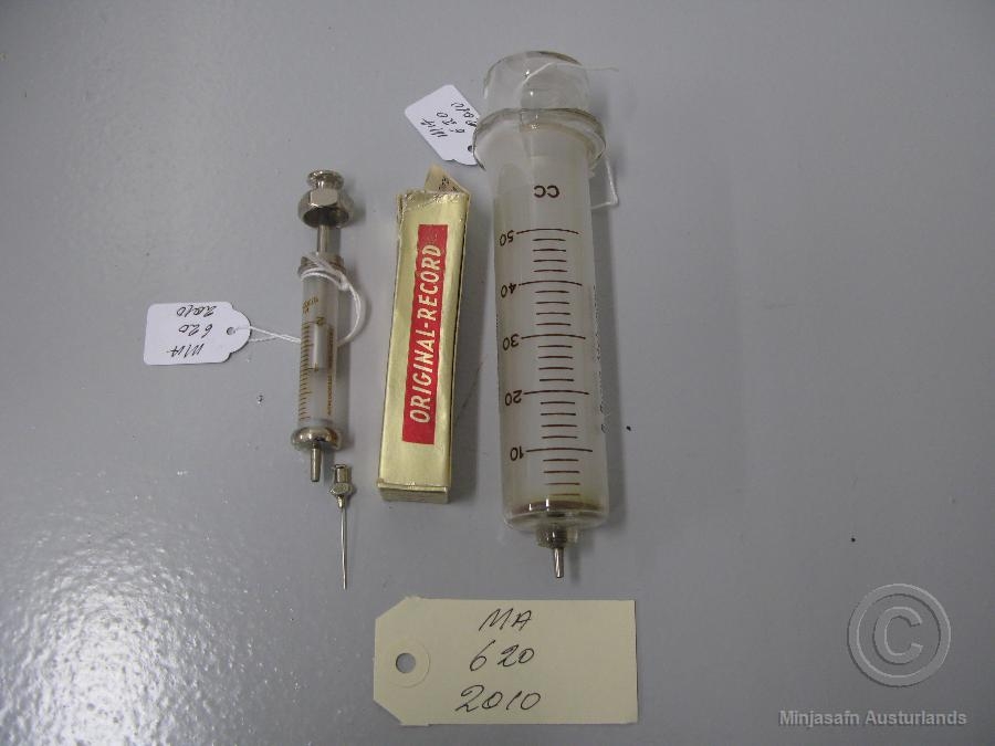Tvær sprautur, önnur er 50 ml og á henni stendur "B. Braun Melsungen-Jena-Glass made in Germany". Sprautan er með glertappa. Önnur 20 ml. sprauta úr gleri og stáli á báðum endum hennar og fylgir nál úr stáli. Á henni stendur "Acufirm V2A", á annari hliðinni og "15" á hinni. Kassi er utan af sprautunni og á honum stendur "Original-Record. Helssluft-steril Sation bis 200 °C". Framleiðandi: Precisa. Made in W-Germany. Kom úr fórum Þorsteins Sigurðssonar, læknis.