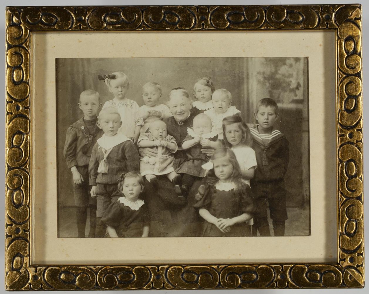 með barnabörn sín. Ljósm. 13 x 16,5 cm., í 1.5 cm. br. ramma: Hópm., 13 manns, Marie Katrine k. Sigurðar Jónssonar fangavarðar, með barnabörn sín.