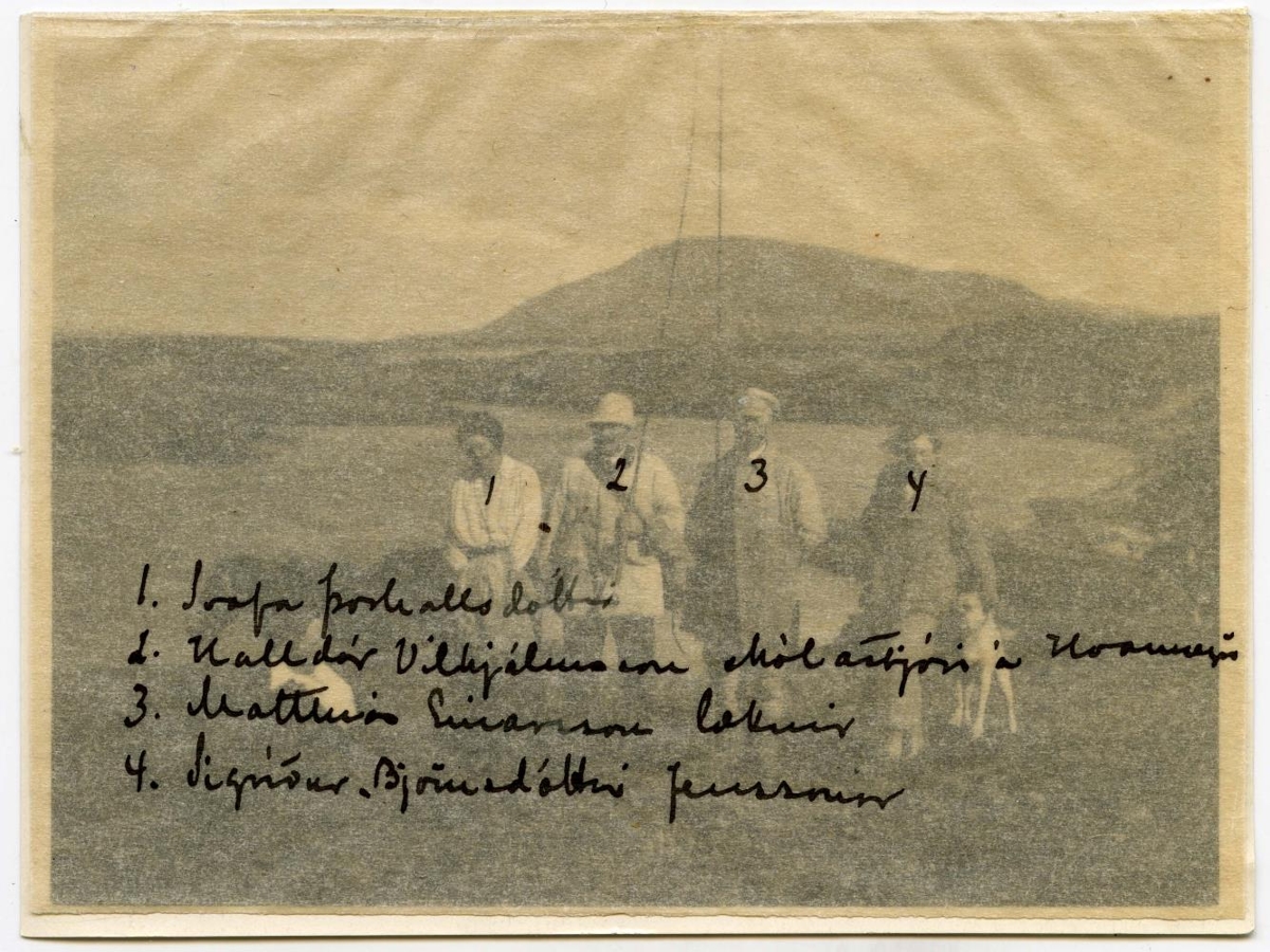 Halldór Vilhjálmsson, skólastjóri á Hvanneyri og kona hans, Svafa Þórhallsdóttir, Matthías Einarsson læknir og Sigríður Björnsdóttir Jenssonar. Blað, 7,8 x 10,3 cm að st.