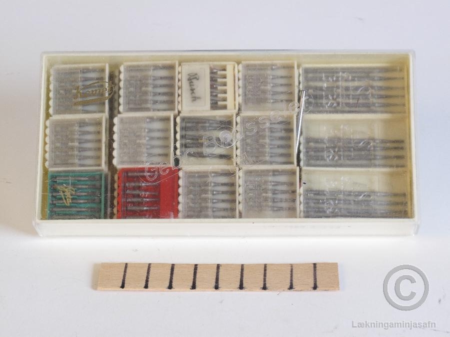 Plastkassi með 36 pökkum af borhausum til tannlækninga, ásamt 8 í lausu.