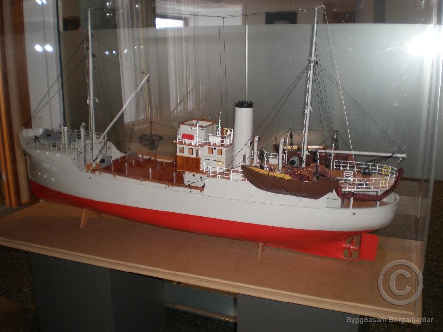 Eldborg, líkan smíðað af Grími Karlssyni. Gefendur: Gunnar Ólafsson fyrrv. skipstjóri og Sigvaldi Arason í Borgarnesi með aðstoð ýmissra kostunaðaraðila. Í ágúst 2008 gáfu þeir líkan af Eldborginni, sem var gerð út frá Borgarnesi í meira en tvo áratugi og á sér því mikilvægan sess í atvinnusögu héraðsins. Í maí 2009 gáfu þeir líkan af Hvítánni, í febrúar 2010 líkan af Hafborginni og í desember 2011 líkön af Laxfossi og Akraborg. Ath. gripurinn er ekki merktur að öðru leyti en að nafn skipsins er tilgreint.