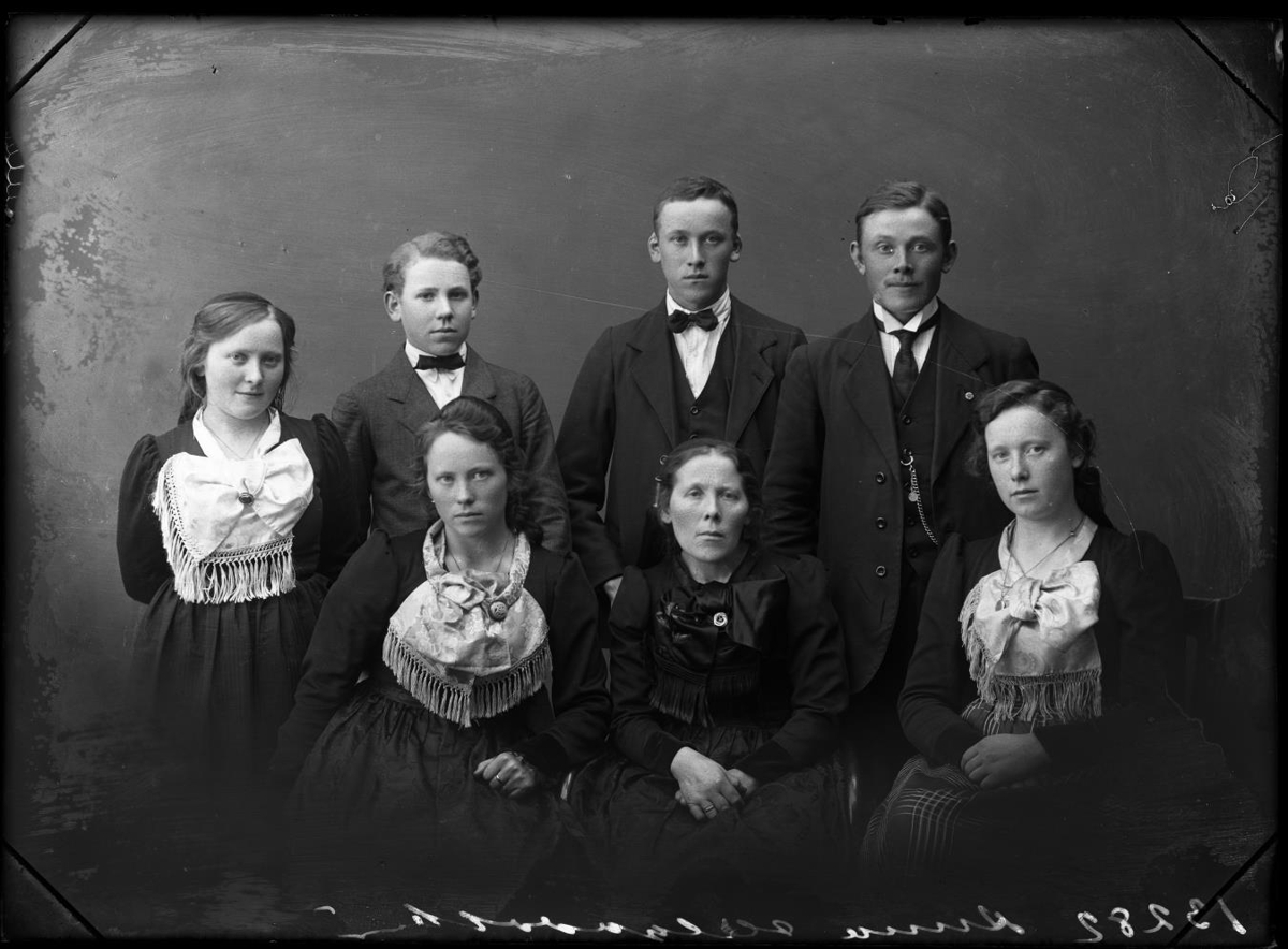 „Þetta er hópmynd af Önnu Helgadóttur og börnum hennar: Aftari röð frá vinstri: Elísabet Erlendsdóttir (1898-1979); Valdimar Þórðarson (1905-1981); Erlendur Erlendsson (1902-1948); Helgi Erlendsson (1894-1945). Fremri röð frá vinstri: Helga Erlendsdóttir (1896-1975); Anna Helgadóttir (1869-1937), Guðlaug Erlendsdóttir (1901-1948). (ES 2018)