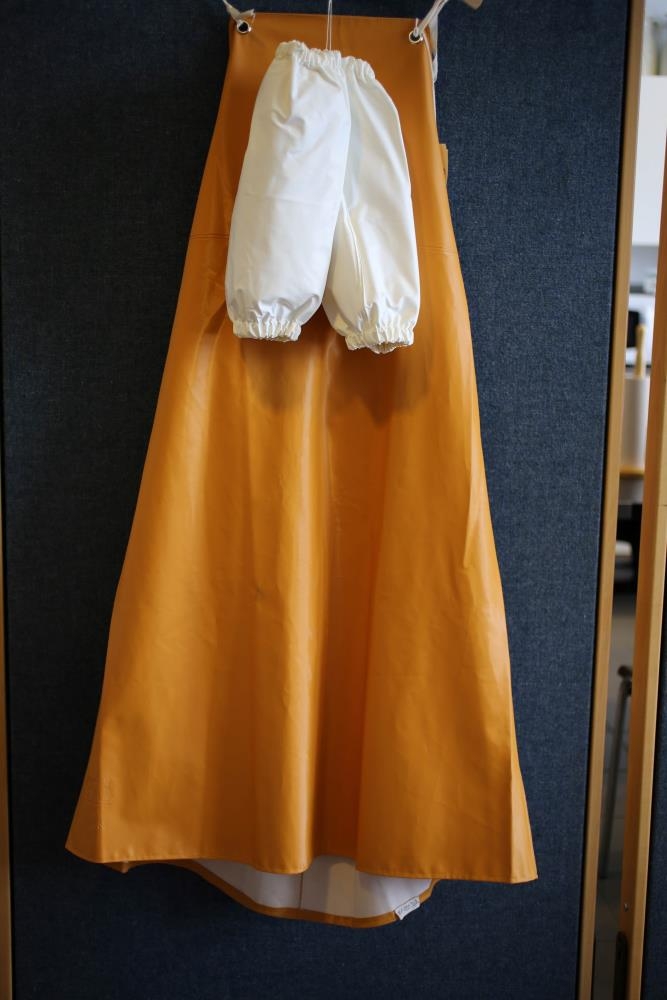 Gult síldarpils sem er alveg ónotað. Er frá 66°N - Sjóklæðagerðinni og stimplað merki neðst til hægri á pilsið. Síldarermar eru með og eru hvítar. Kom úr verslun Pálínu Waage.