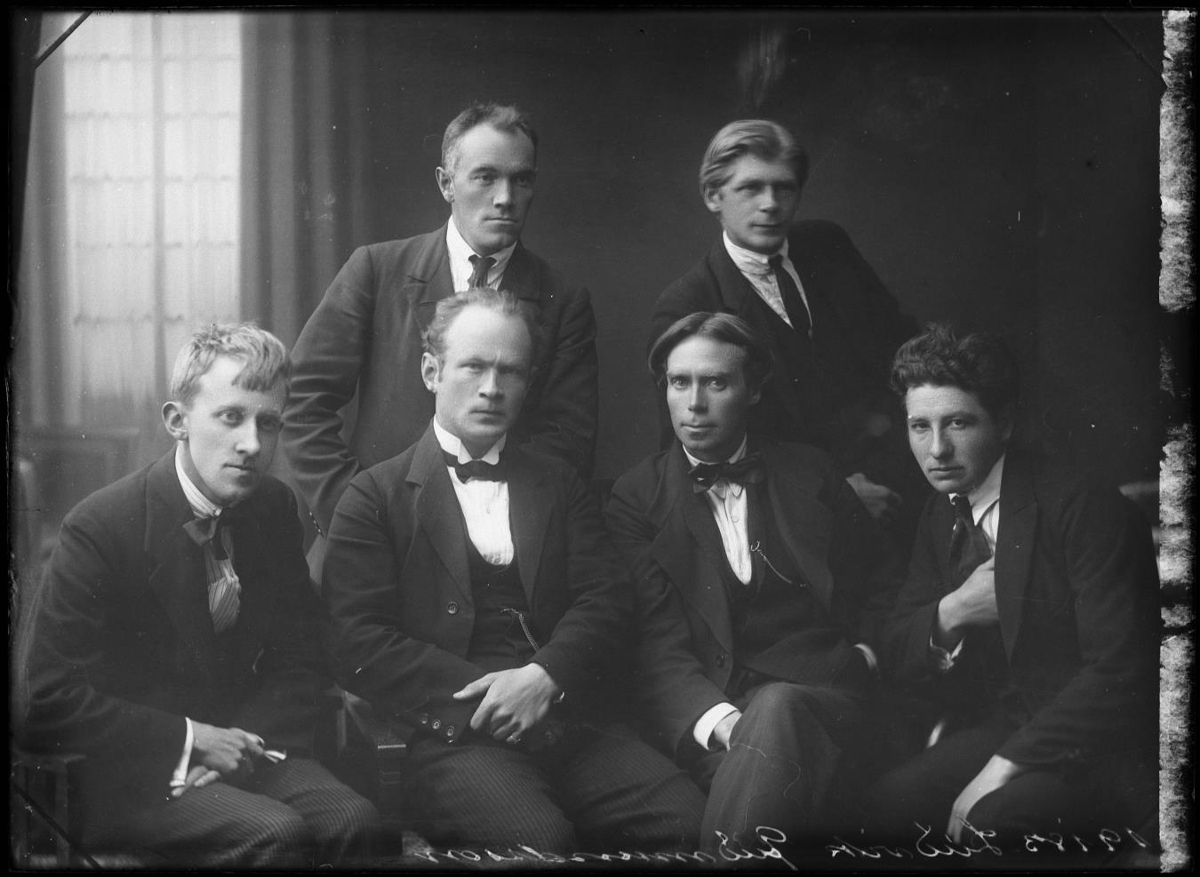 „Frá vinstri neðri röð: Halldór Laxness rithöfundur, Lúðvík Guðmundson guðfræðingur, Stefán frá Hvítadal skáld, Ásgeir Bjarnþorsson listmálari. Efri röð: Jón Pálsson tónlistarmaður og Björn Bjornsson teiknari.“ (PBB 2025)