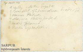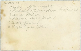 Starfsfólk á ljósmyndastofu Sigurðar Guðmundssonar er í kaffihléi og spjalla saman. Á bakhlið: 1. Hallý - dóttir Sigurðar. 2. Benedikt Guðmundsson bróðir Sigurðar. 3. Hannes Pálsson. 4. Magnea Katrín Þórðardóttir. 5. Herdís Jóhannsdóttir. 6. Kristín Sigurðardóttir.