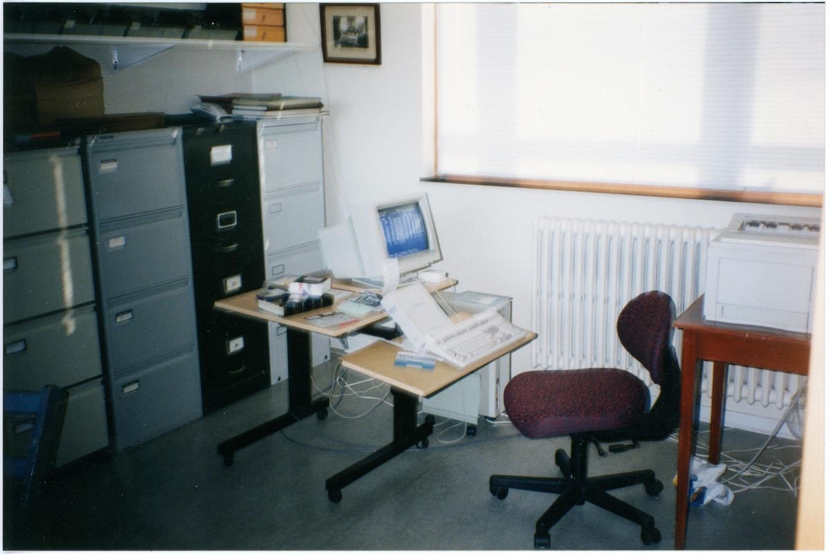 Tölvuborð f. miðju, skjalaskápar við vegg t.v., gluggi og lítið borð með prentara t.h.
