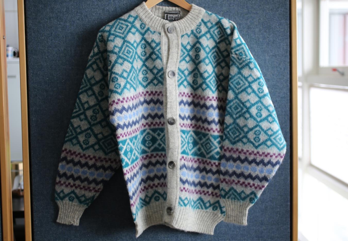 Hneppt peysa, ljósgrá með grænni og fjólubláu munstri. "Dyngjupeysa." Stærð L. "Curly product, Egilsstaðir, Iceland Dyngja h.f. prjónastofa."