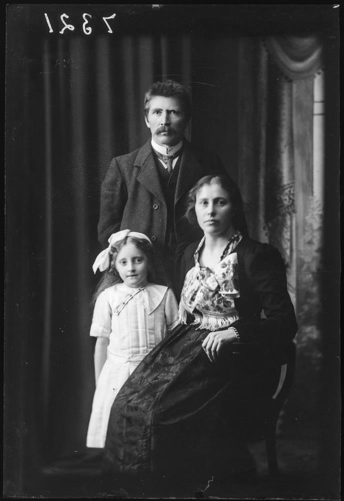 „Þetta er líklega Guðmundur Davíðsson (1874-1953) kennari ásamt konu sinni Málfríði Soffíu Jónsdóttur (1878-1962) og dótturinni Klöru (1907-1981). Frakkastígur 12 var heimili fjölskyldunnar.“ (ES 2025)