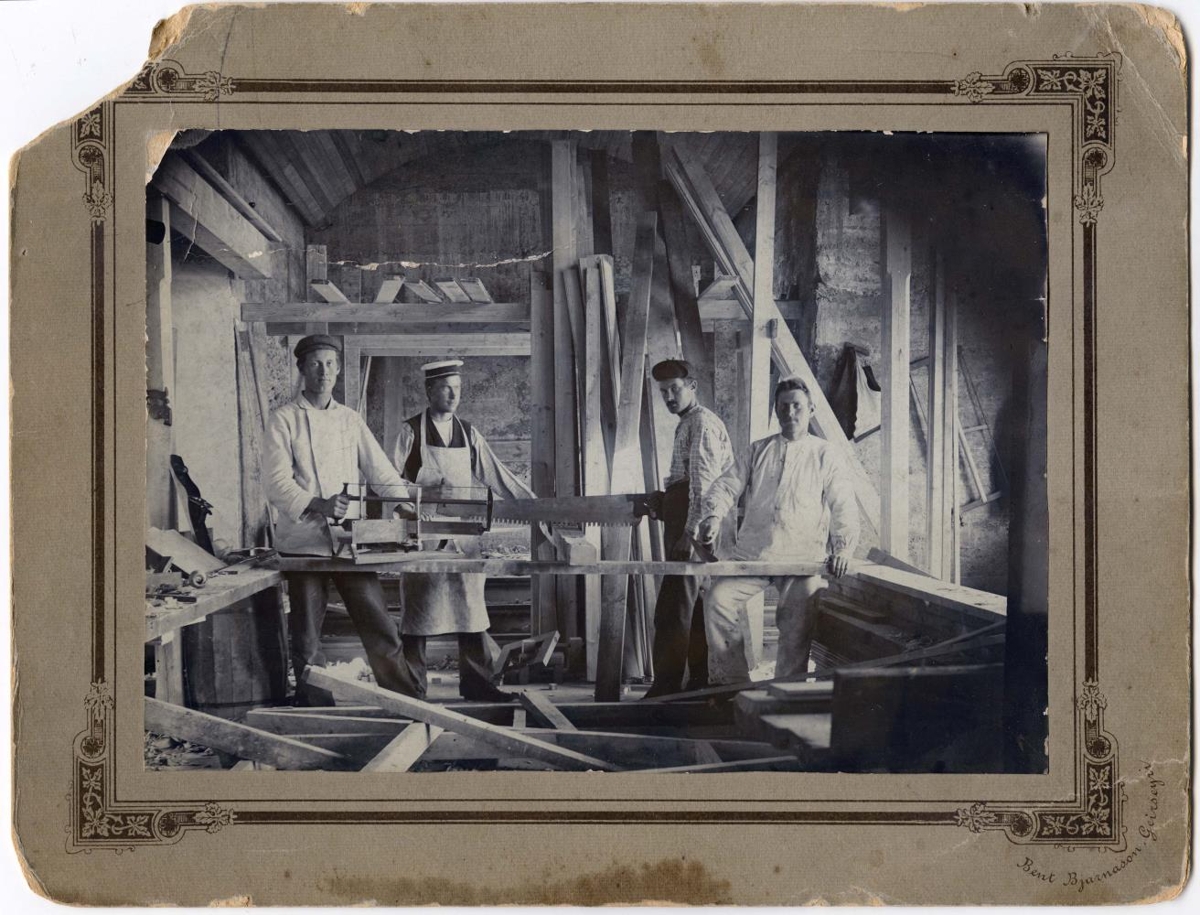 Fjórir karlmenn við byggingu steinhúss stilla sér upp til myndatöku, stillansar og uppsláttartimbur bak við hópinn. Þrír eru með sagir í hönd en sá fjórði með múrskeið. Á myndspjaldinu er merking ljósmyndarans: Bent Bjarnason Geirseyri. Og á bakhlið: Smíði Patreksfjarðarkirkju.