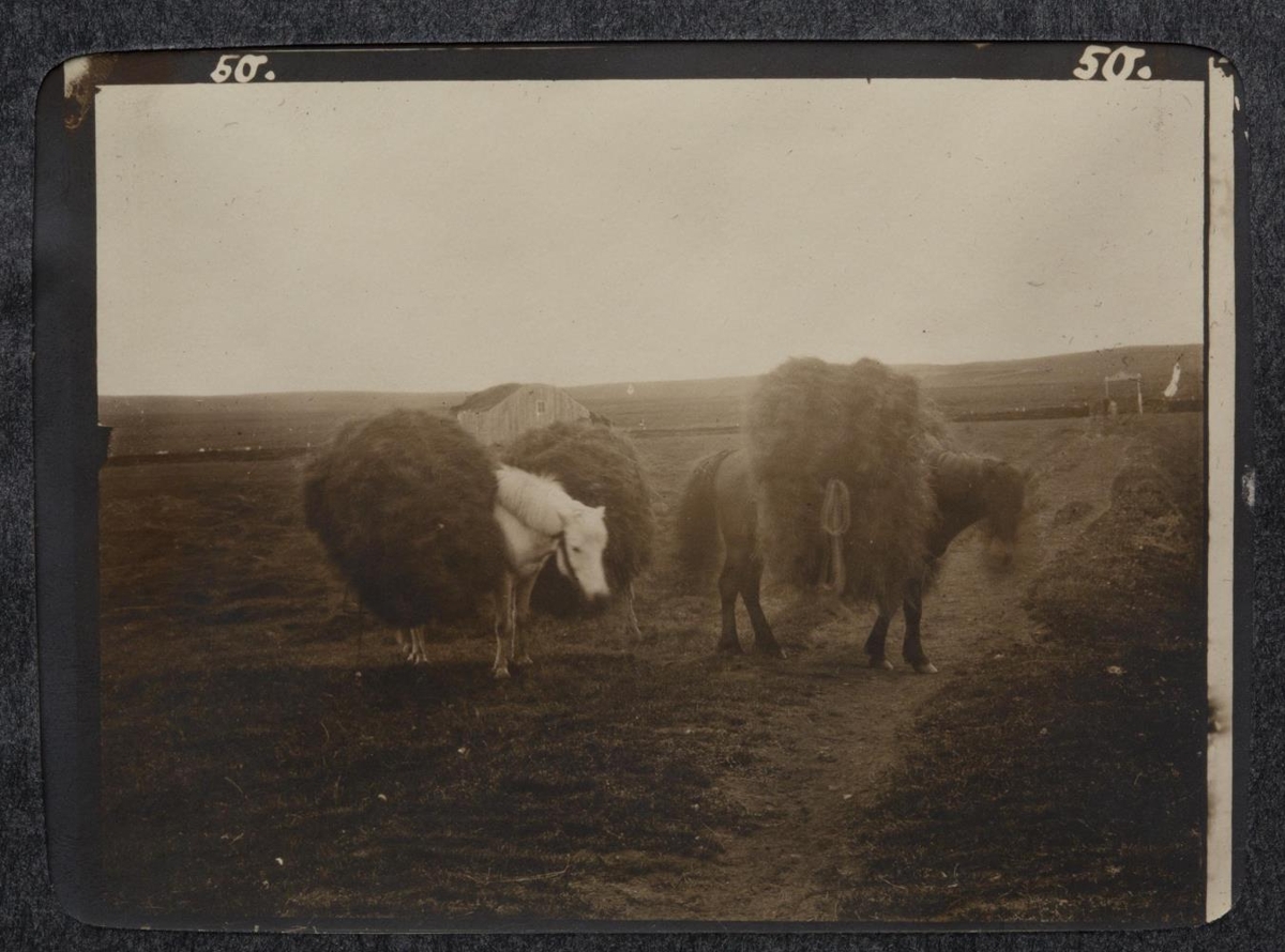 Tveir burðarklárar með uppbundna heybagga. Áskrifaða myndarnúmerið er: 50.
