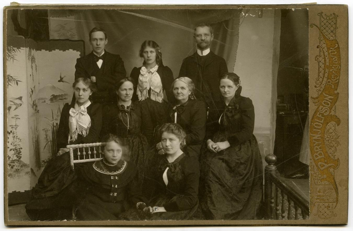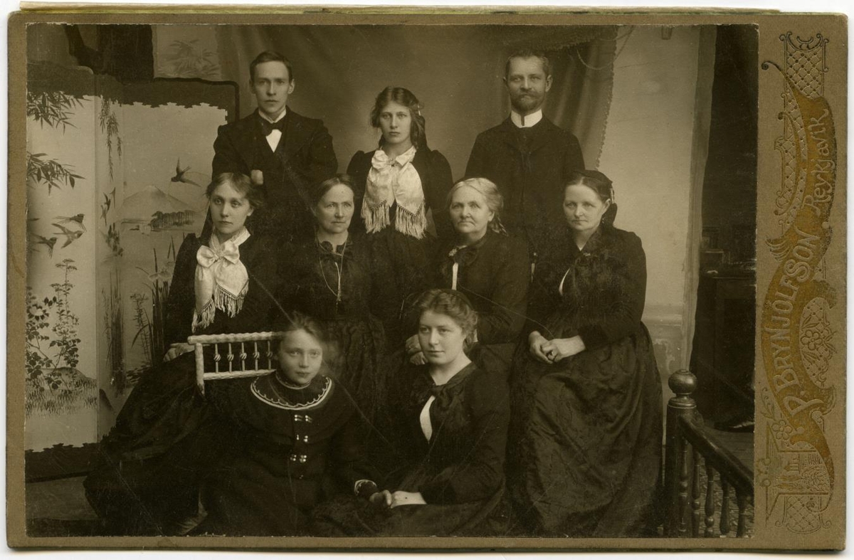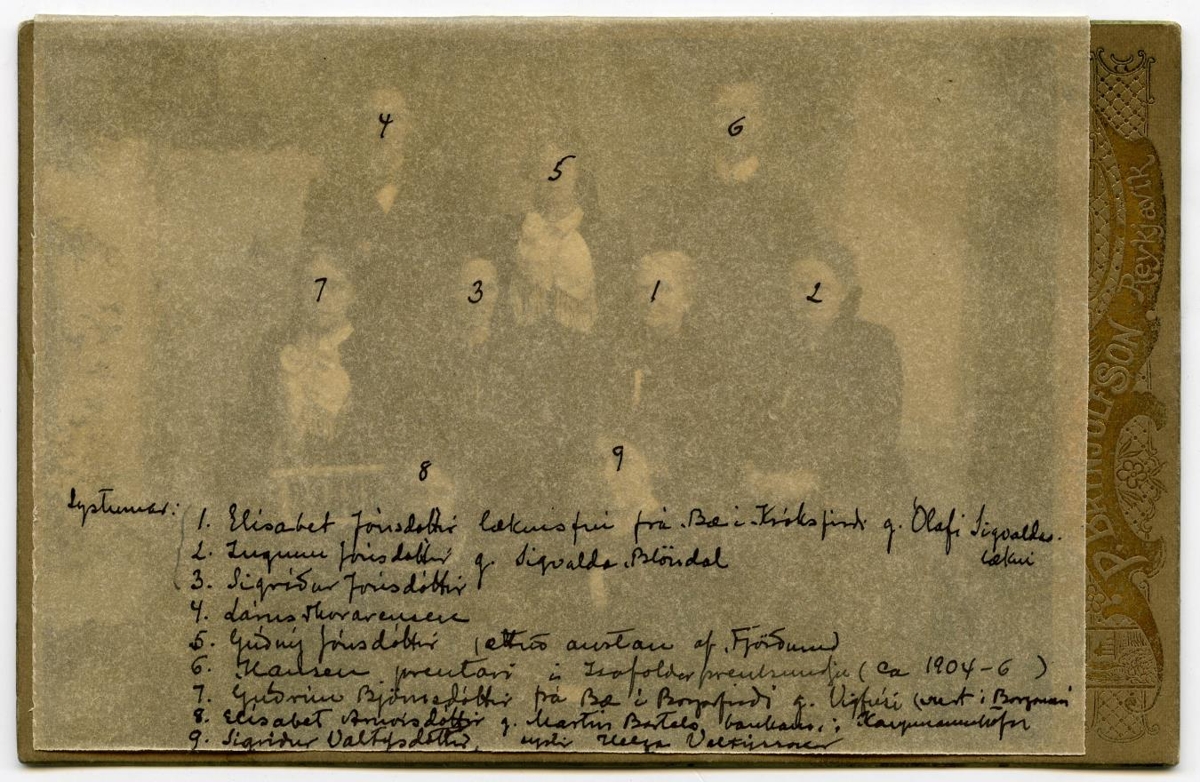9 saman. (Efsta röð) Lárus Thorarensen, Guðný Jónsdóttir (ættuð úr Austfjörðum) og Hansen, prentari í Ísafoldarprentsmiðju, (h.u.b. 1904 - 06.) (Miðröð) Guðrún Björnsdóttir, frá Bæ í Borgarfirði, g. Vigfúsi "vert" í Borgarnesi, systurnar frk. Sigríður Jónsdóttir, frú Elísabet ekkja Ólafs, læknis, Sigvaldasonar í Bæ og Ingunn, ekkja Sigvalda Blöndals, dætur séra Jóns í Steinnesi. (Fremsta röð) Elísabet Arnórsdóttir, g. Martin Bartels, bankam. í Kaupmhöfn, og Sigríður, systir Helga Valtýssonar (tvö eintök).