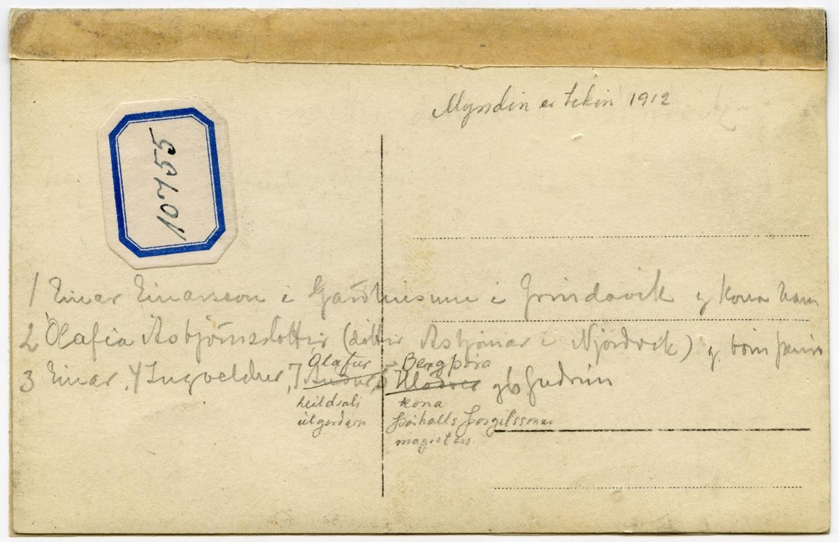 7 saman. Einar Einarsson, Garðhúsum í Grindavík ...... kona hans Ólafía, dóttir Ásbjarnar í Njarðvík, og börn þeirra, Einar, Ingveldur, g. Rafni Sigmunds.? skipstj., Auður, Hlöðver og Guðrún, g. Einari Kristjánssyni á Heklu.
