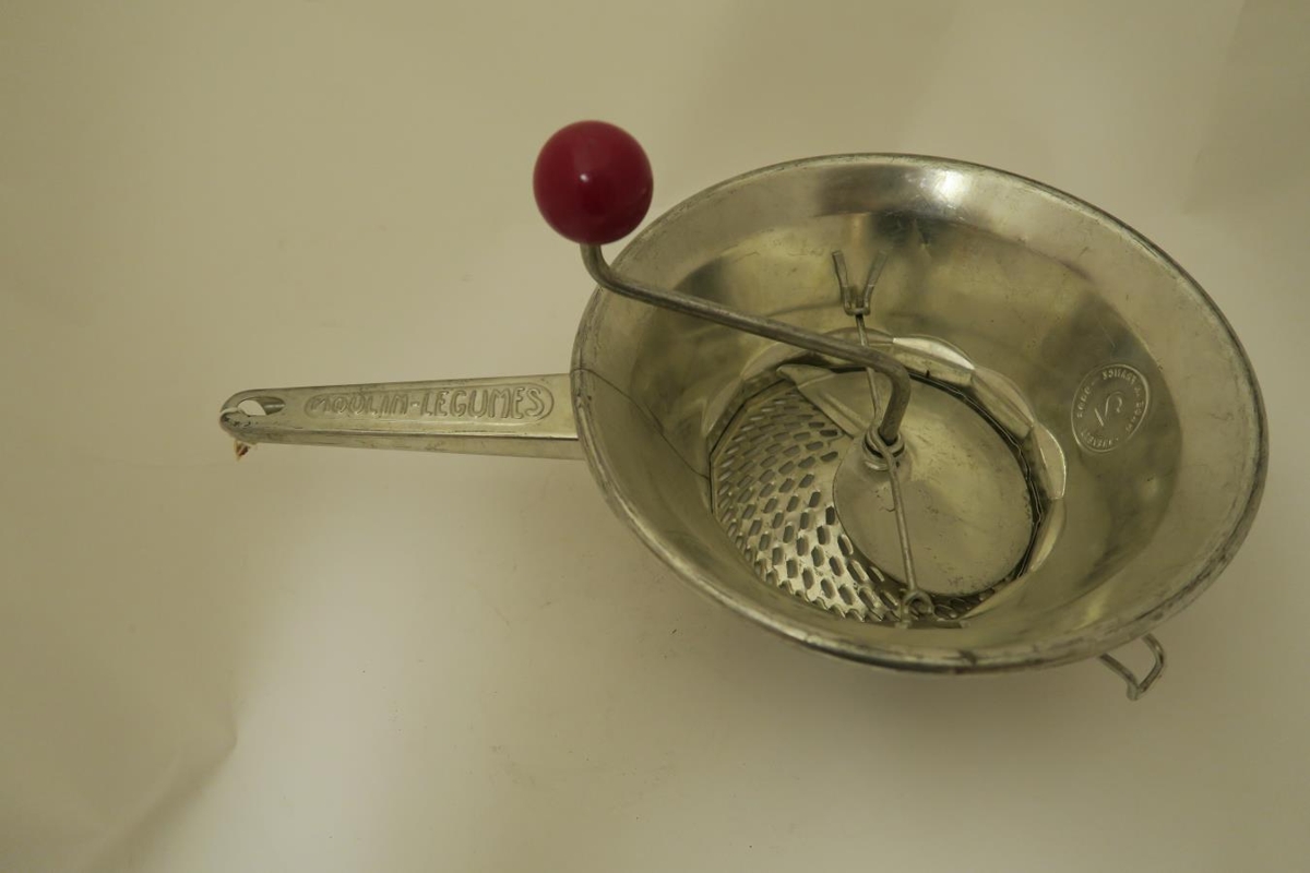 Stór handsnúin grænmetiskvörn með haldi. Hringlaga, rauður hnúður á snúningssveif. 2 auka rifjárn fylgja. Áletrun: Moulin legumes.