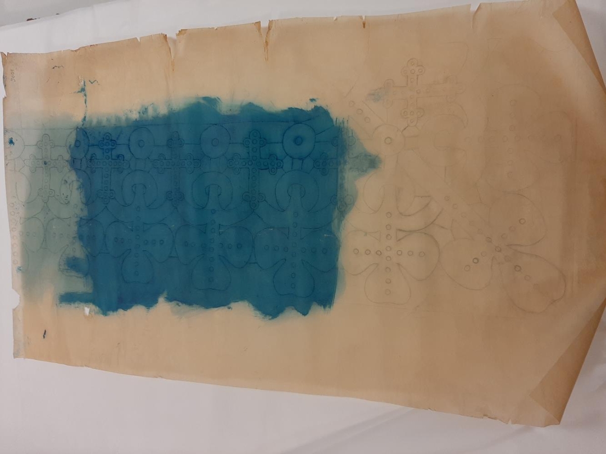 Uppdráttur af mynstri af altarisdúk á smjör- eða sníðapappír. Mynstrið gatað í pappírinn, búið að fara yfir með bleki.