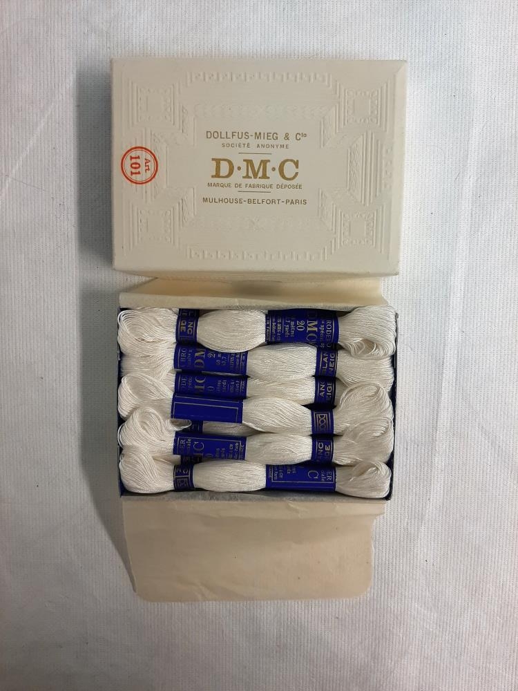 Askja með DMC garni nr. 101. Askjan er opin og í henni 12 garndokkur.