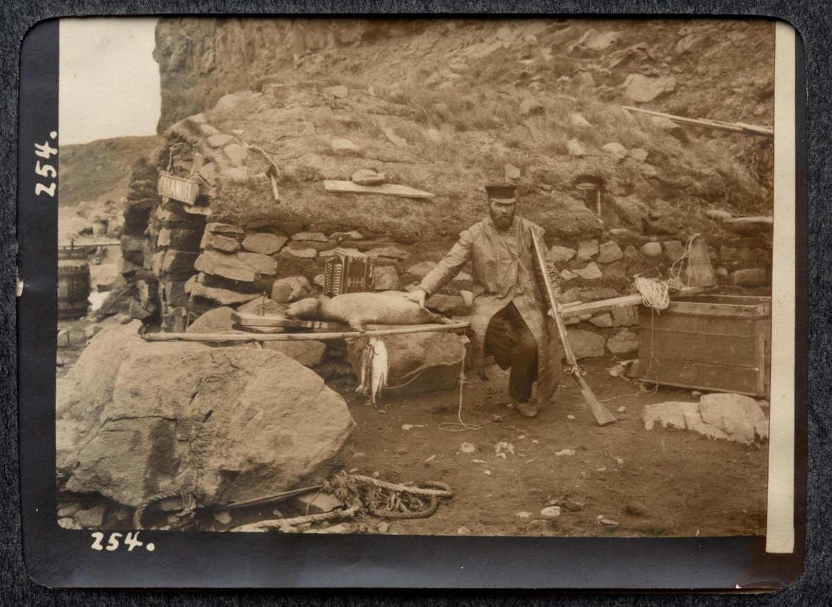Jón Ósmann ferjumaður á Héraðsvötnum situr við kofa sinn og styður hendi á dauðan sel sem liggur á steini við hlið hans. Hann hallar langhleyptri byssu að annarri öxlinni. Kofinn er hlaðinn úr grjóti og reft yfir með torfi. Yfir dyraopinu t.v. má sjá skilti sem á stendur EMANUEL. Ýmis amboð og annað dót liggur hér og hvar. Áritaða myndarnúmerið er: 254.